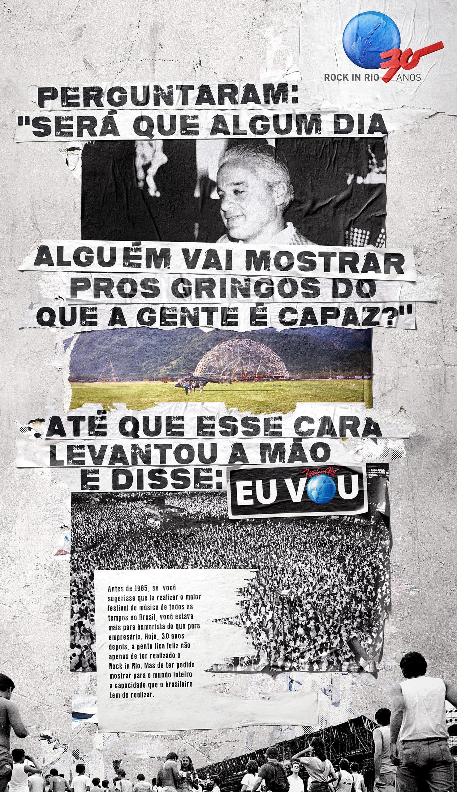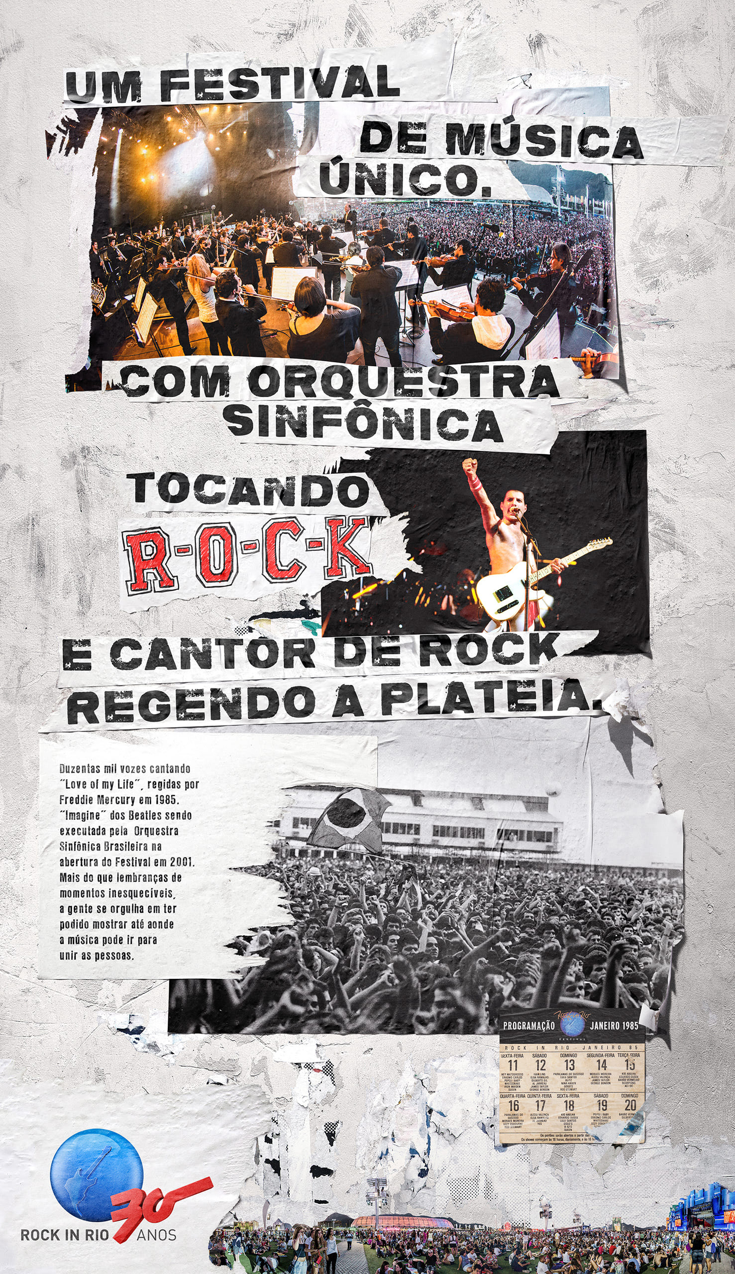 [PT BR] - Com muito orgulho fomos convidados para produzir as imagens para a campanha de 30 anos do Rock in Rio. Optamos por além de banco de imagem, produzir e fotografar diversos cartazes em branco e vários muros pela cidade, com isso conseguimos material para fazer uma arte com bastante riqueza de detalhes.