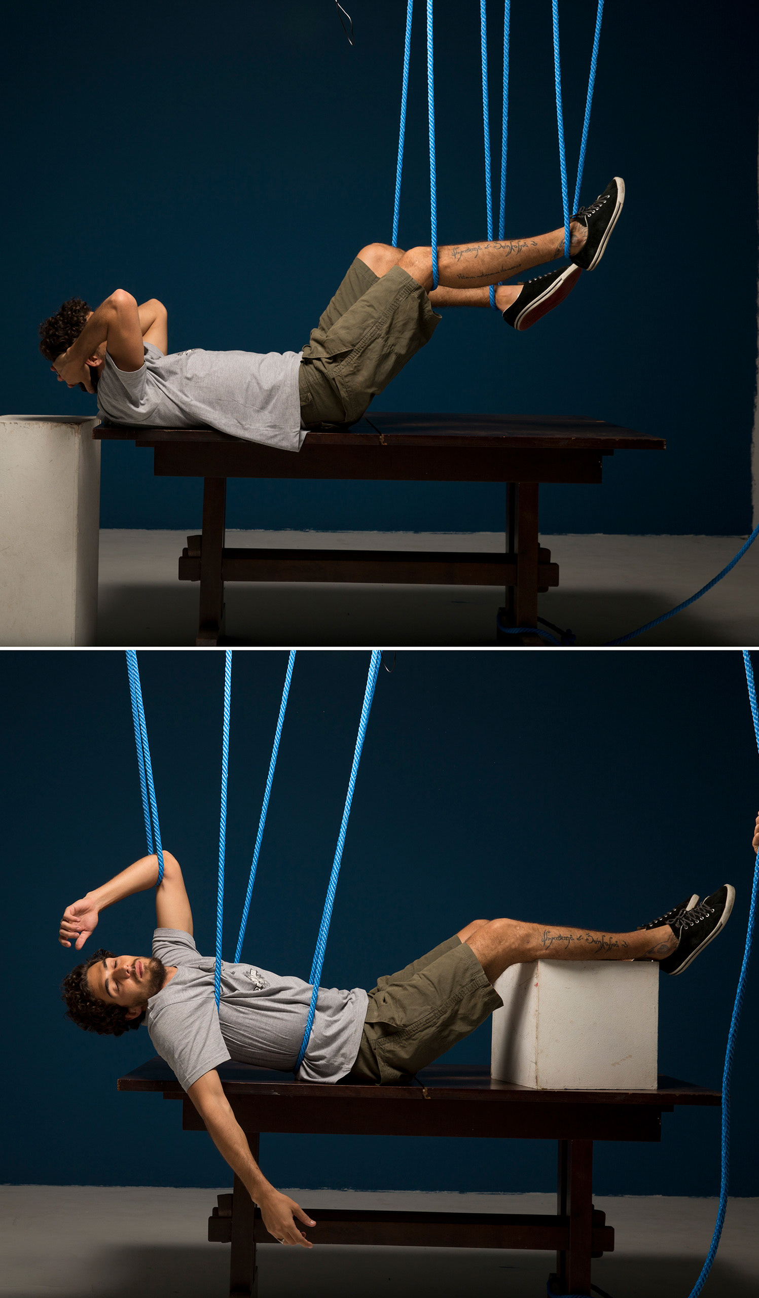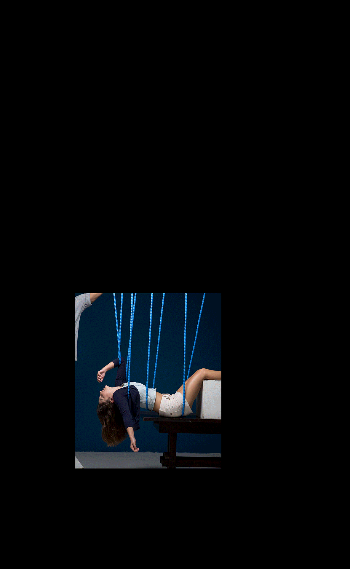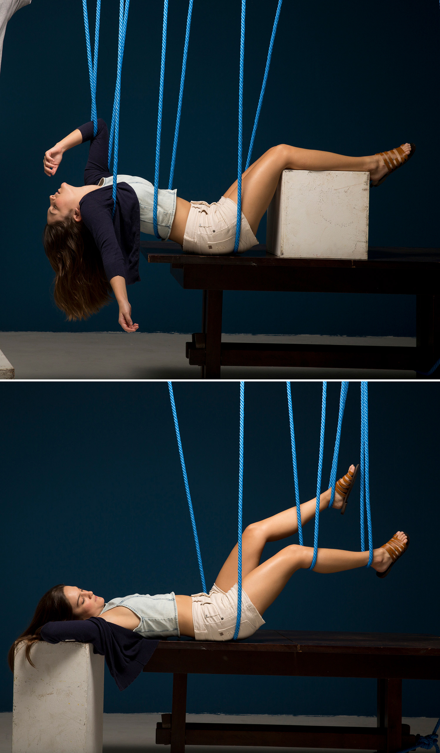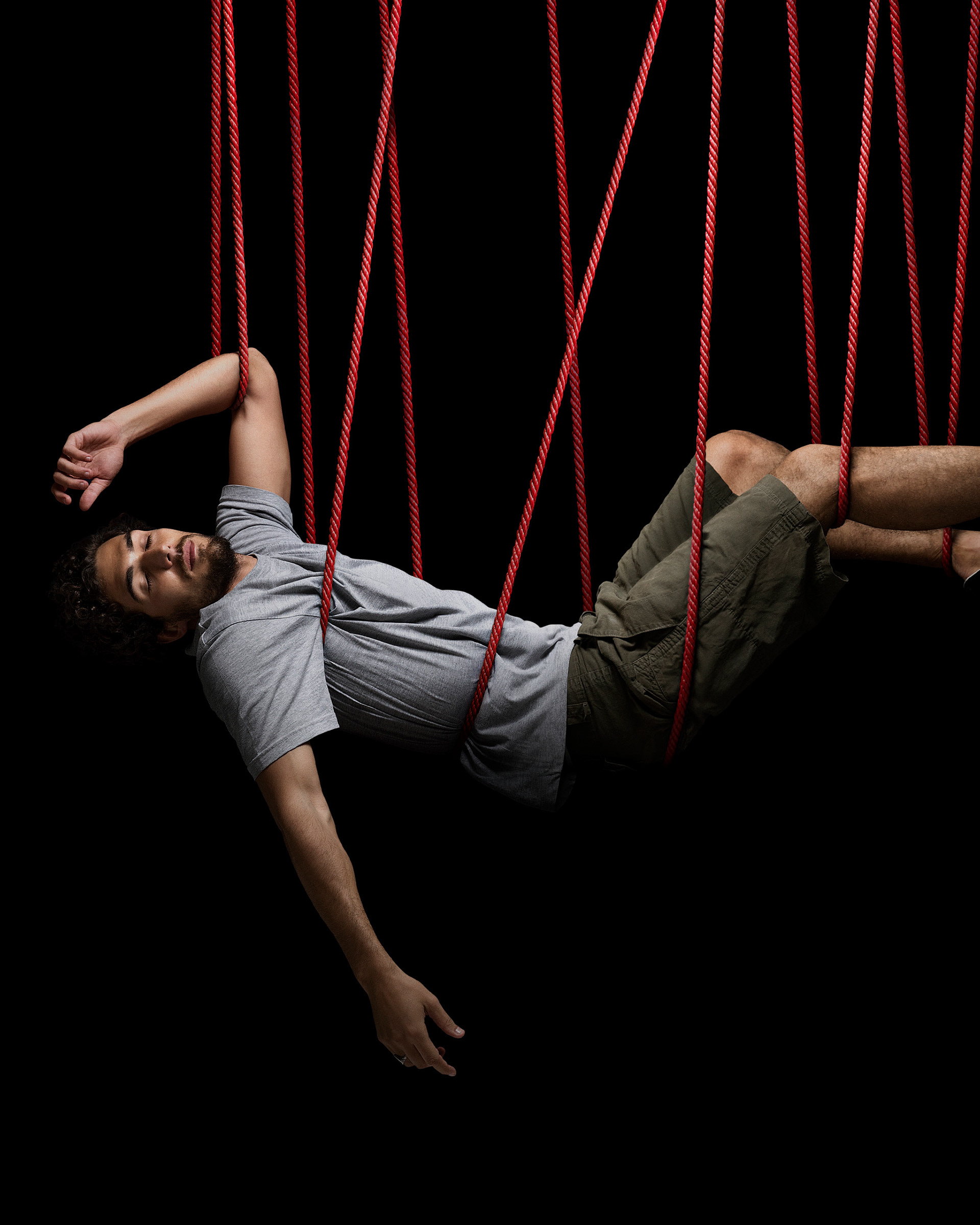 We received photos of the models in a few different positions, split in two with the ropes from the waist up and then down, so we could merge the two parts together in post-production. Also check out a close-up of the final image.